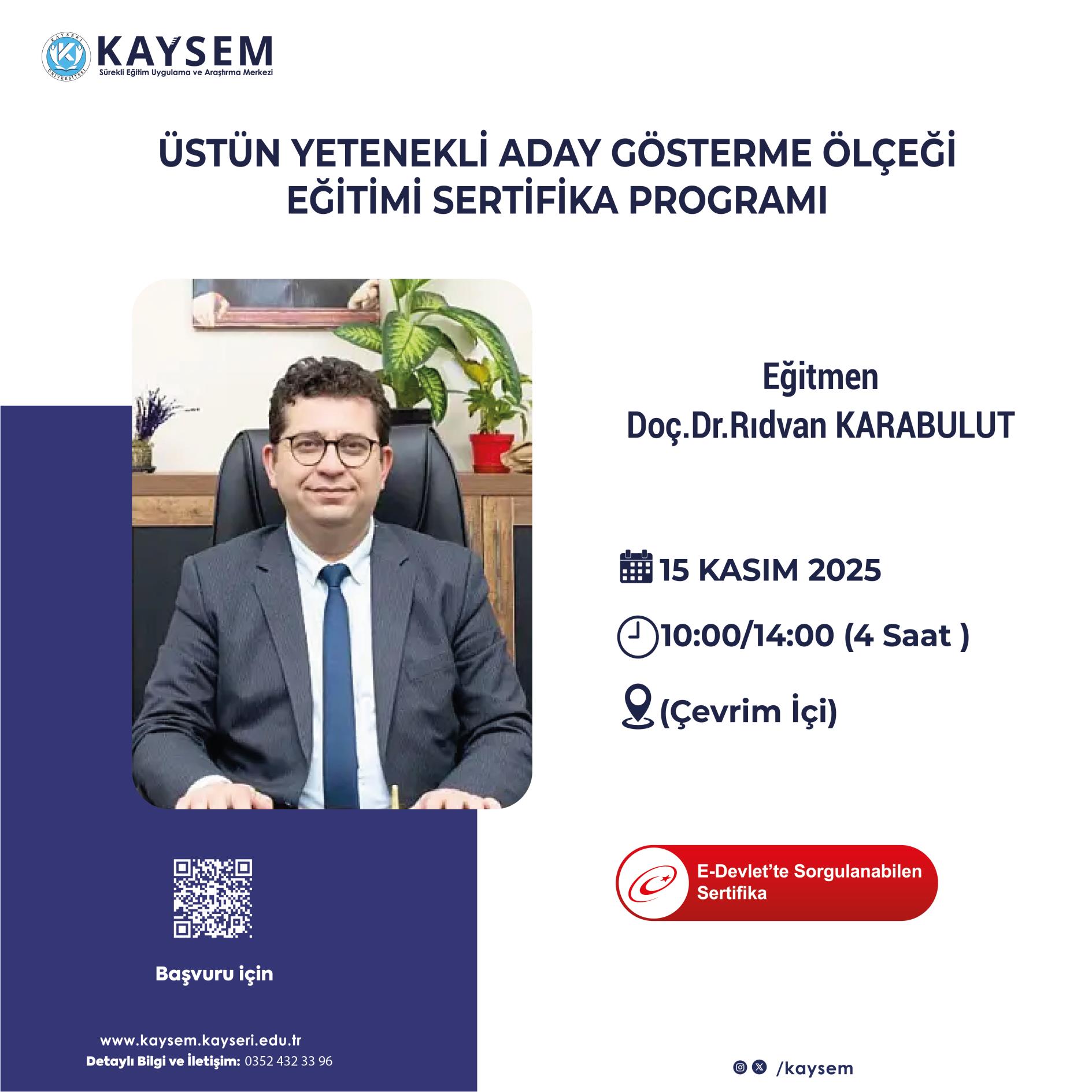 Kayseri Üniversitesi Sürekli Eğitim Uygulama ve Araştırma Merkezi (KAYSEM) tarafından düzenlenen “Üstün Yetenekli Aday Gösterme Ölçeği Eğitimi Sertifika Programı”, 15 Kasım 2025 tarihinde çevrim içi olarak gerçekleştirilecektir.