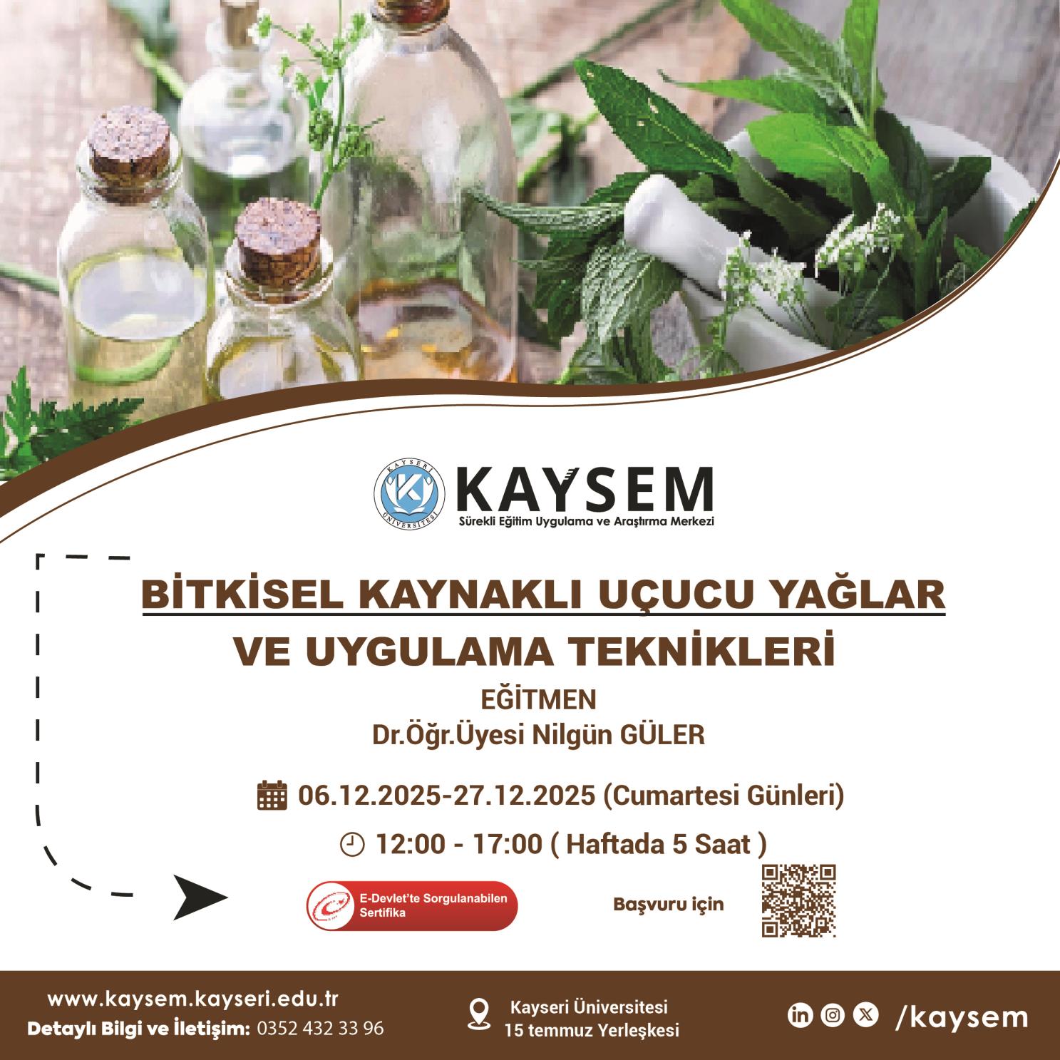 Kayseri Üniversitesi Sürekli Eğitim Uygulama ve Araştırma Merkezinde  Bitkisel Kaynaklı Uçucu Yağlar ve Uygulama Teknikleri,06 Aralık 2025 Cumartesi günü başlayacaktır.