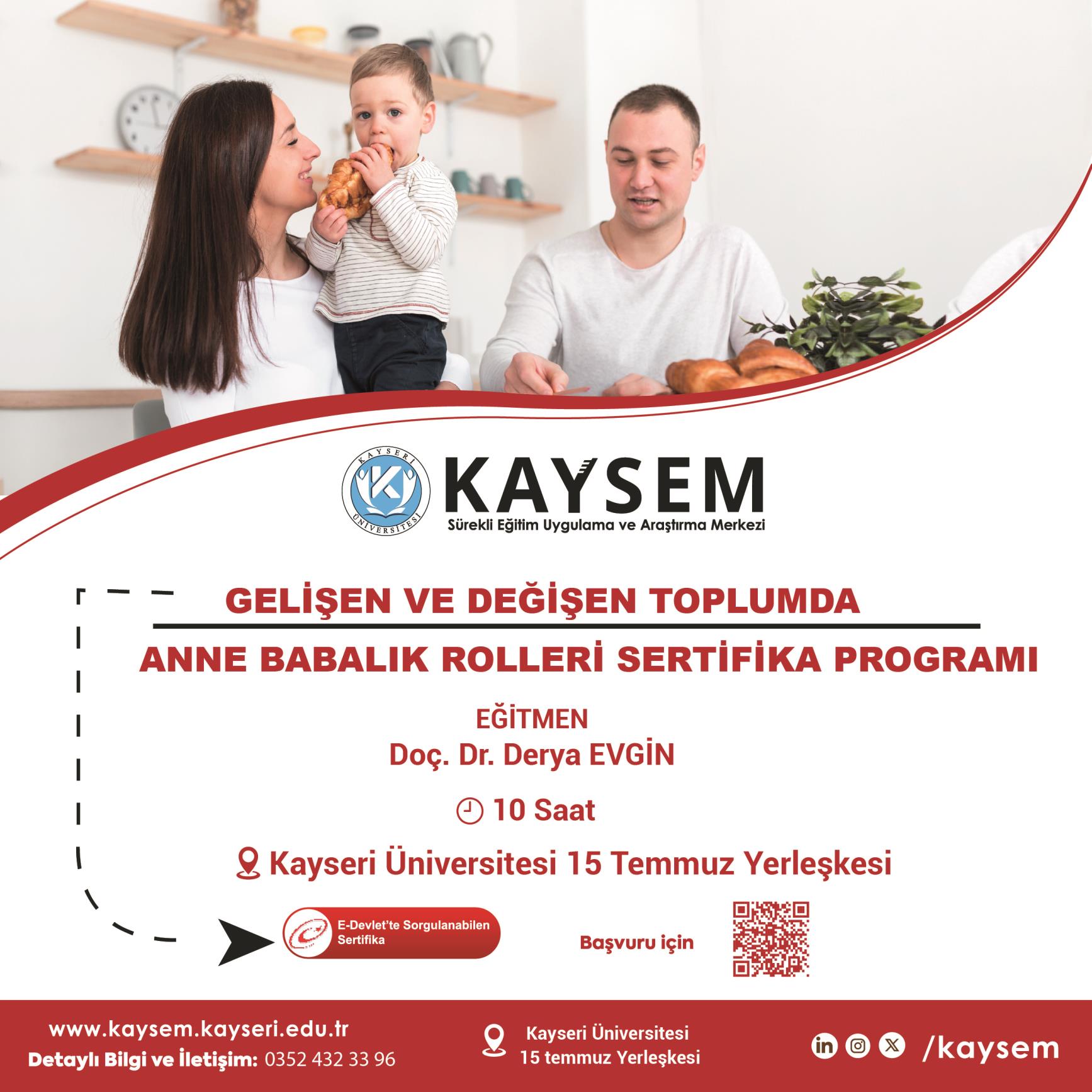 Kayseri Üniversitesi Sürekli Eğitim Uygulama ve Araştırma Merkezi (KAYSEM) tarafından düzenlenen GELİŞEN VE DEĞİŞEN TOPLUMDA ANNE BABALIK ROLLERİ SERTİFİKA PROGRAMI başvuruları başlamıştır.