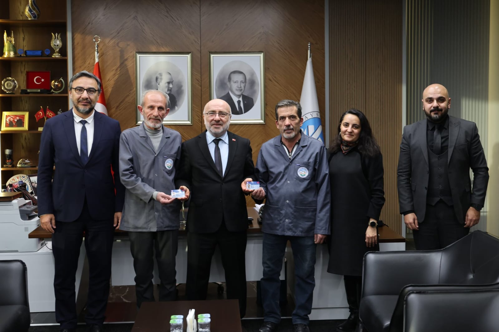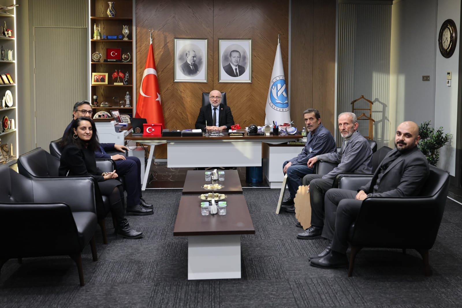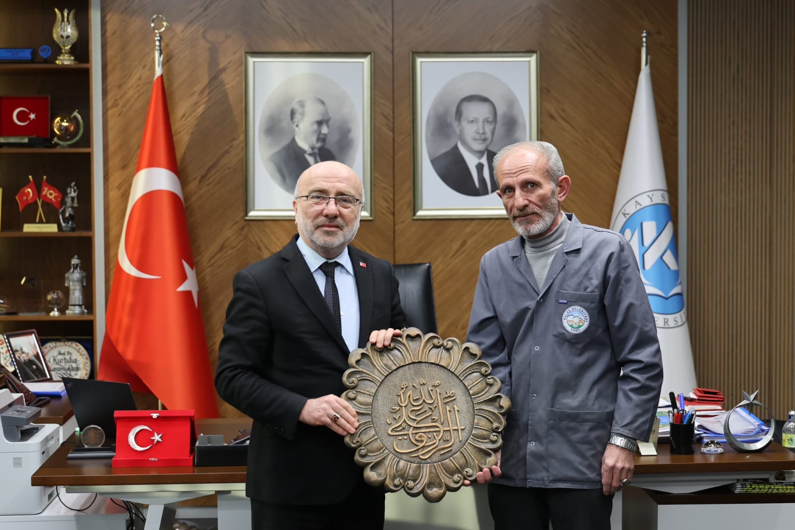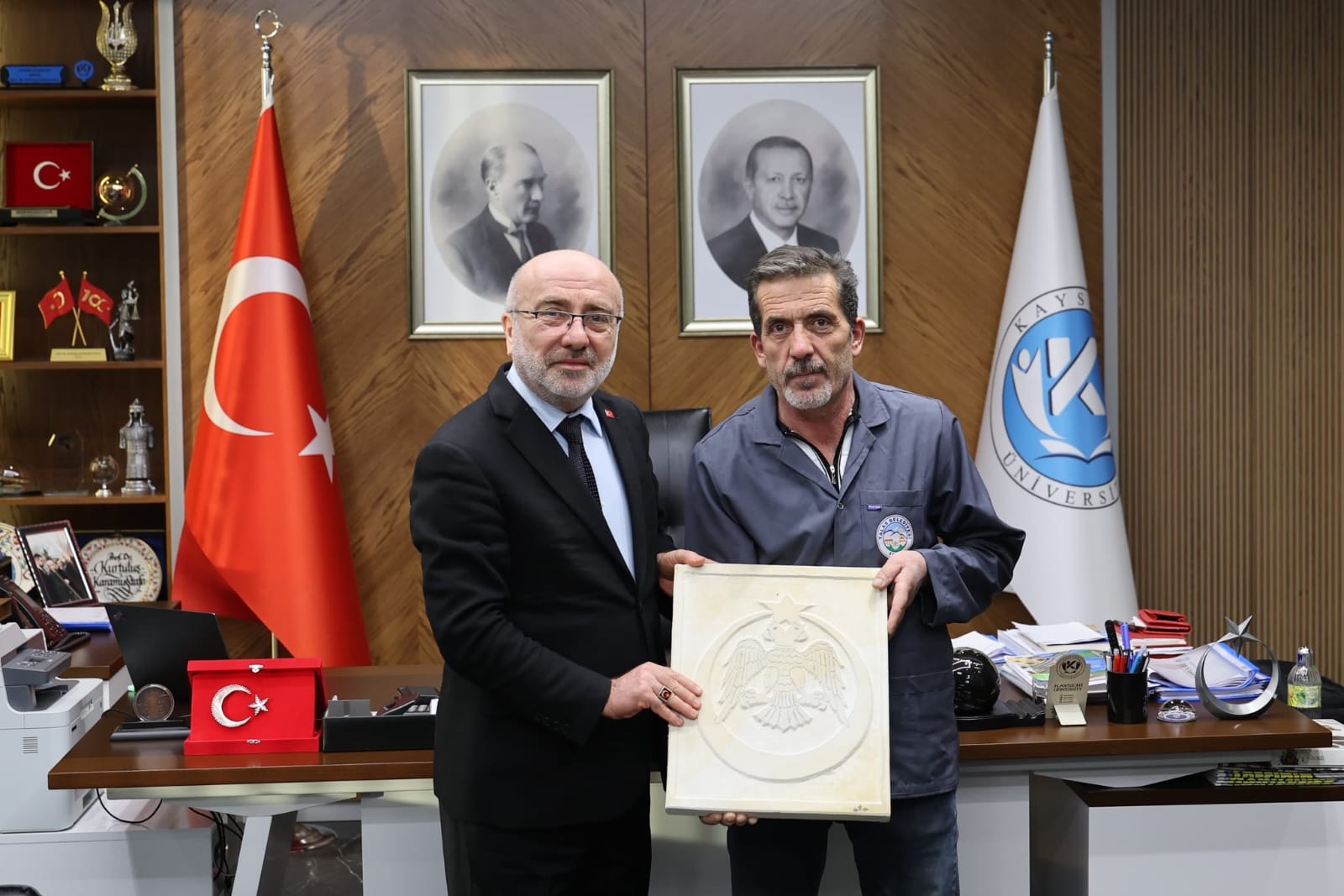 Kayseri Üniversitesi ile Talas Belediyesi iş birliğiyle hayata geçirilen Talas Restorasyon Eğitim Merkezi (TAREM) bünyesinde görev yapan ustalar, Kültür ve Turizm Bakanlığı tarafından Somut Olmayan Kültürel Miras Taşıyıcısı unvanını almaya hak kazanmalarının ardından Kayseri Üniversitesi Rektörü Prof. Dr. Kurtuluş Karamustafa’yı ziyaret etti.