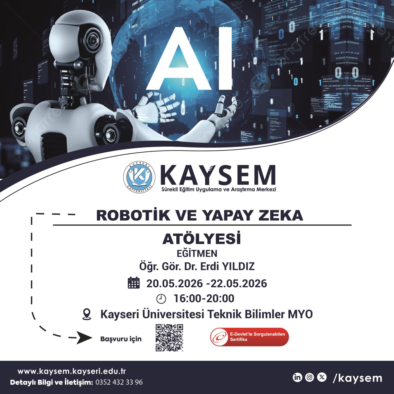 Kayseri Üniversitesi Sürekli Eğitim Uygulama ve Araştırma Merkezi (KAYSEM) tarafından düzenlenen Robotik ve Yapay Zeka Atölyesi Eğitim başvuruları başlamıştır.