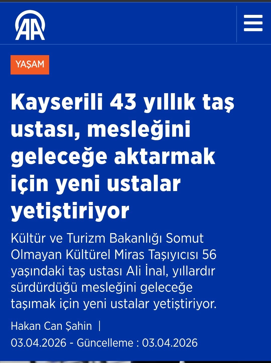 Taşları kırmak ve şekillendirmek için kullanılan çekiç, tokmak, murç, dişli ve düz kalem gibi aletleri kalfa ve çıraklık dönemlerinde elinden hiç bırakmayan İnal, işinde ustalaştığı mesleğini 43 yıldır severek yapmanın mutluluğunu yaşıyor.